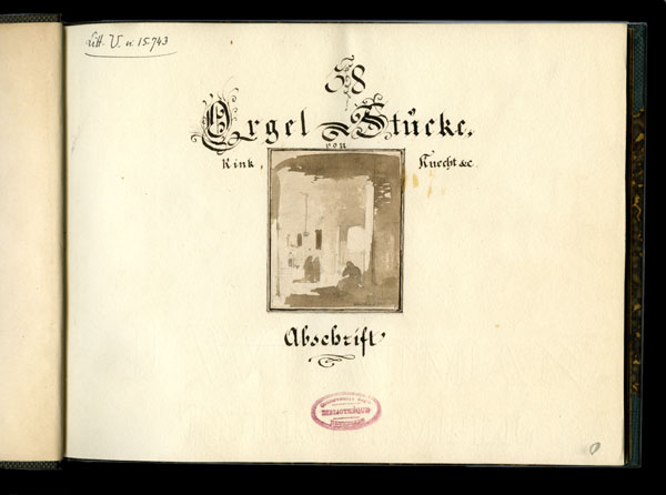 | Collection of organ works composed between 1770 and 1845. Title page in the handwriting of Wagener, decorated with a watercolour presumably painted by Wagener. |