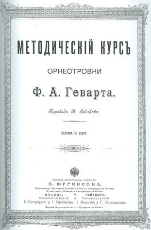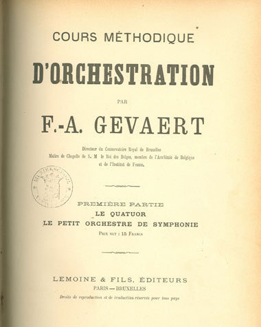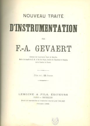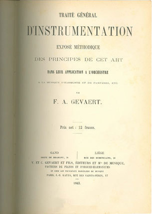 Gevaert also published some standard works about orchestration and instrumentation. His Traité général d’instrumentation (1863) was translated several times, amongst others by Peter Tsjaikovski, who was responsible for a Russian edition. Vladimir Rebikov made a Russian translation of his Cours méthodique d’orchestration.